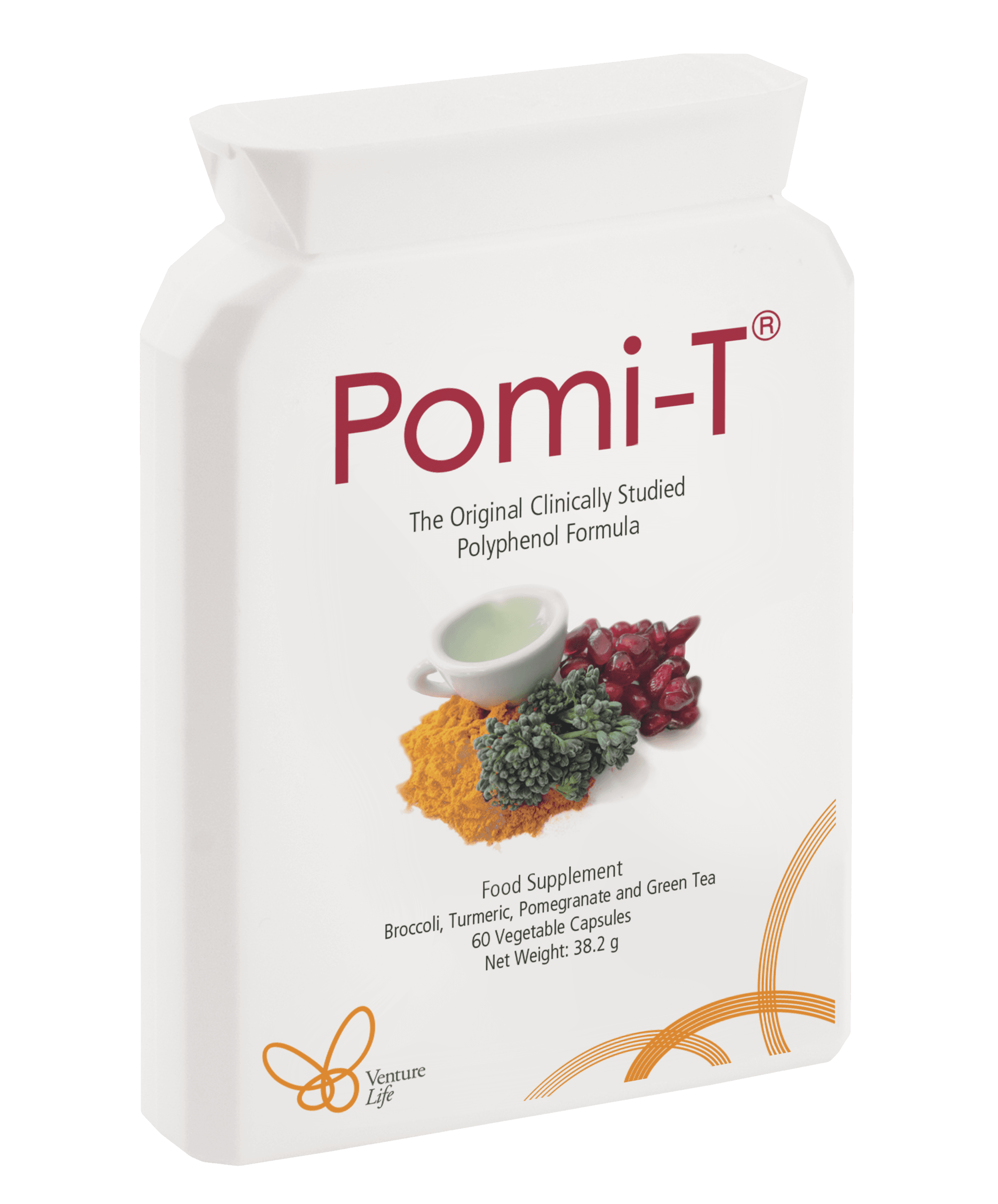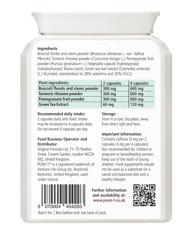 Pomi-T® combines broccoli, turmeric, green tea and pomegranate in its original multi-polyphenol formulation, delivering a consistent blend of naturally occurring polyphenols in one convenient daily capsule.